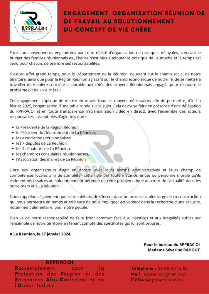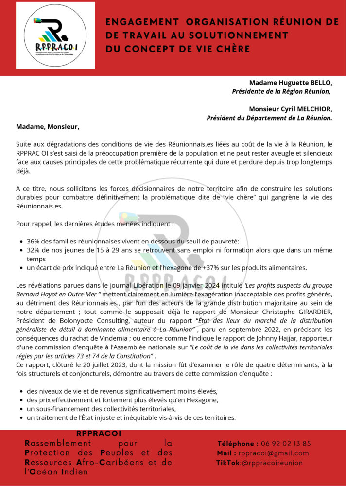 Face à la problématique persistante de la vie chère qui impacte lourdement les foyers réunionnais, le Rassemblement pour la Protection des Peuples et des Ressources Afro-Caribéens et de l’Océan Indien (RPPRAC OI) appelle à une mobilisation des autorités locales. Dans un courrier adressé à Huguette Bello, présidente de la Région Réunion, et Cyrille Melchior, président du Département de La Réunion, le collectif souligne l’urgence d’agir pour trouver des solutions pérennes.