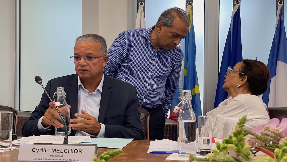 De gauche à droite : Cyrille Melchior, président du Département; Idriss Omarjee, directeur de cabinet de la Région (formé à l’école Vergès) et Huguette Bello, présidente de la Région. (Crédit photos : Y.M)