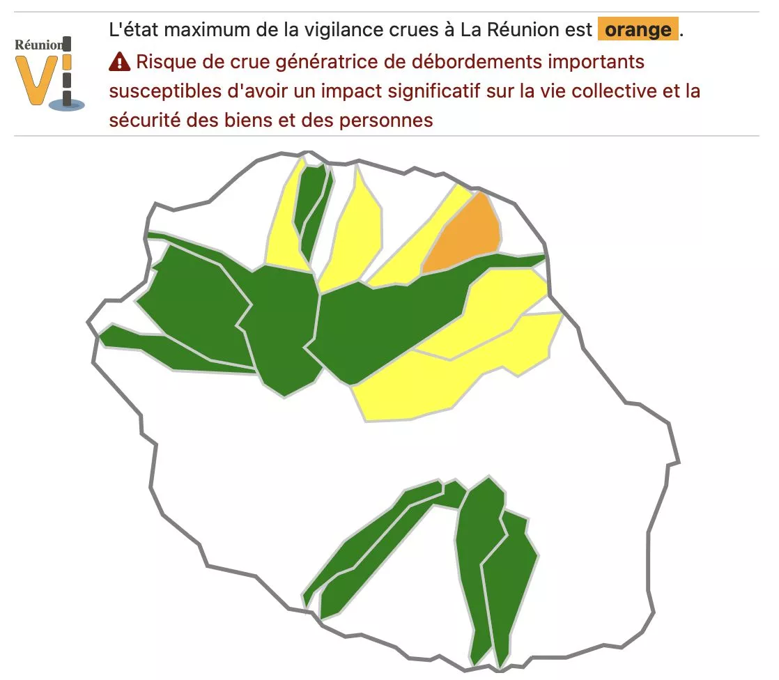 Maintien de la vigilance en JAUNE : rivière Saint Denis, rivière des Pluies, rivière Sainte Suzanne, rivière des Roches, rivière des Marsouins.