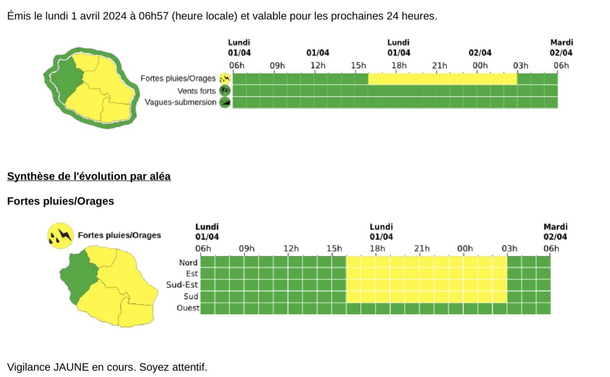La situation se dégrade franchement à partir de la seconde partie d’après-midi puis soirée, avec de fortes averses se déclenchant à l’Est d’une ligne s’étirant de Saint-Denis à Saint-Pierre. La prudence est alors de rigueur à proximité des ravines et des radiers. La situation étant instable, un coup de tonnerre n’est également pas exclu. Cet épisode pluvio-orageux s’atténue progressivement au cours de la nuit.