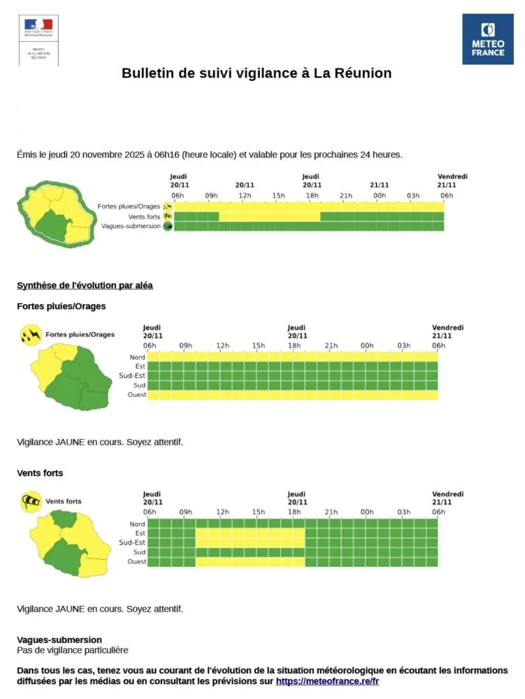 Météo-France place l’île en vigilance jaune dès l’aube ce jeudi 20 novembre. À partir de 06h, des pluies parfois soutenues et des orages peuvent toucher le Nord, le Nord-Est et le Nord-Ouest avant de se renforcer nettement en soirée. Les averses pourraient devenir localement intenses et se prolonger jusqu’à vendredi 06h, avec un risque accru de ruissellements et de dégradations ponctuelles des conditions de circulation.