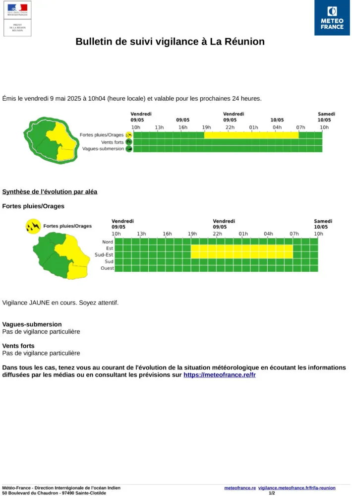 Météo France a placé l’Est et le Sud-Est de La Réunion en vigilance jaune pour fortes pluies et orages à partir de 19h ce vendredi 9 mai. La prudence est recommandée dans ces secteurs, notamment en raison des risques de ruissellements et de mauvaises conditions de circulation.