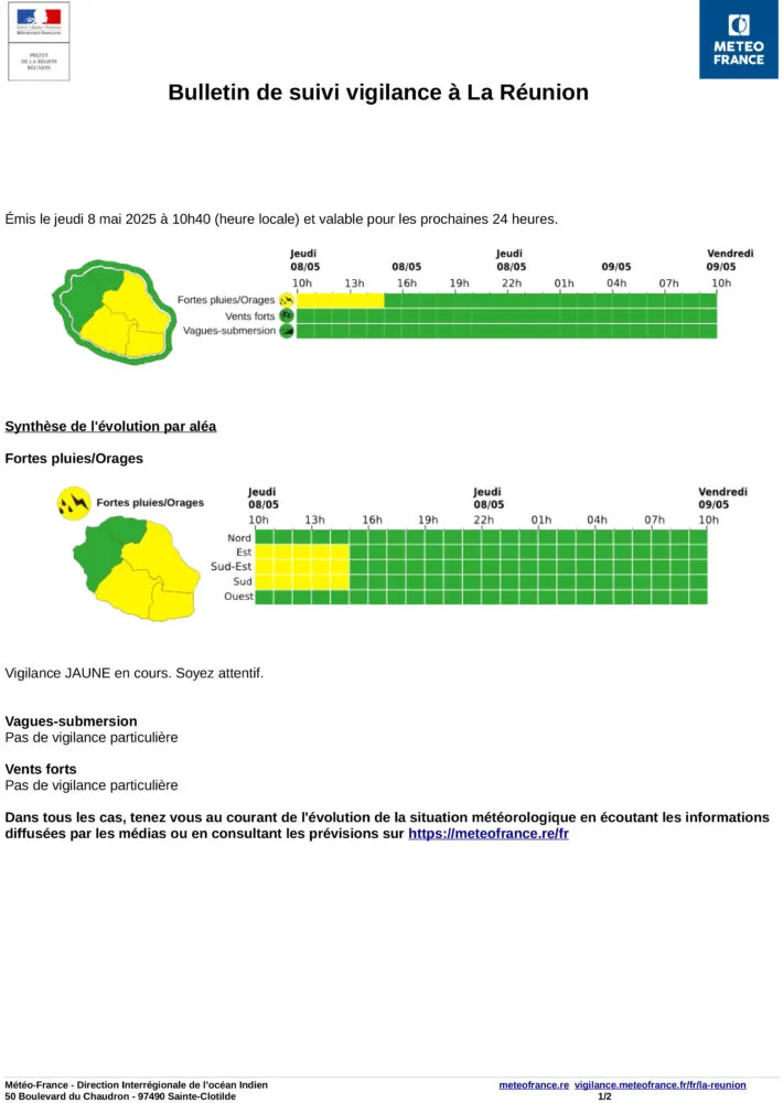 Des averses localement soutenues et des coups de tonnerre sont possibles dans les zones concernées. La prudence est recommandée, notamment sur les routes et aux abords des ravines.