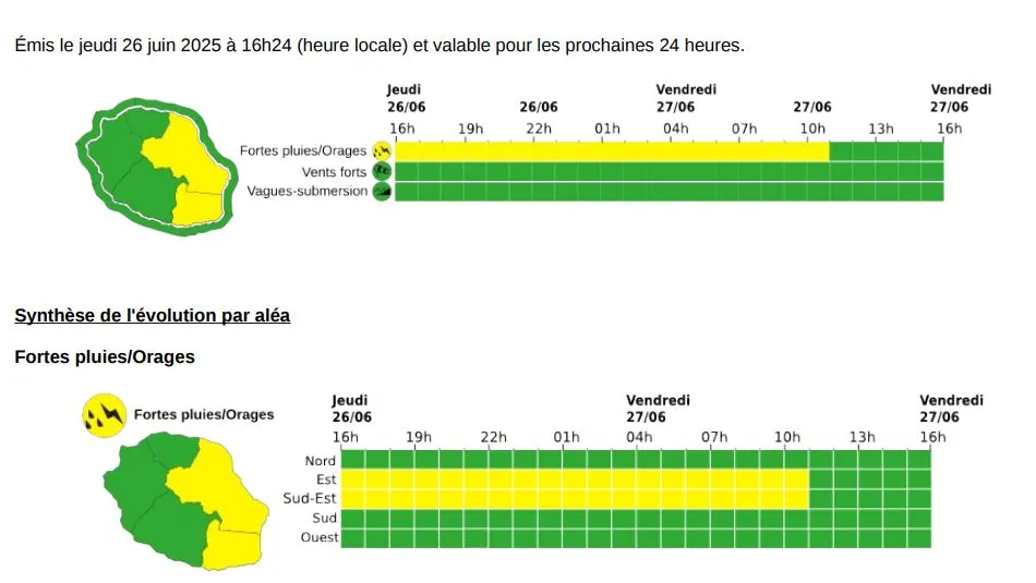 Météo France a placé les zones Est et Sud-Est de La Réunion en vigilance jaune fortes pluies et orages ce jeudi 26 juin à partir de 16 heures. La situation devrait se maintenir jusqu’au vendredi 27 juin à 11 heures. Sont principalement concernés les secteurs allant de Saint-Denis au Sud sauvage, en passant par Salazie, la Plaine-des-Palmistes et le Volcan.