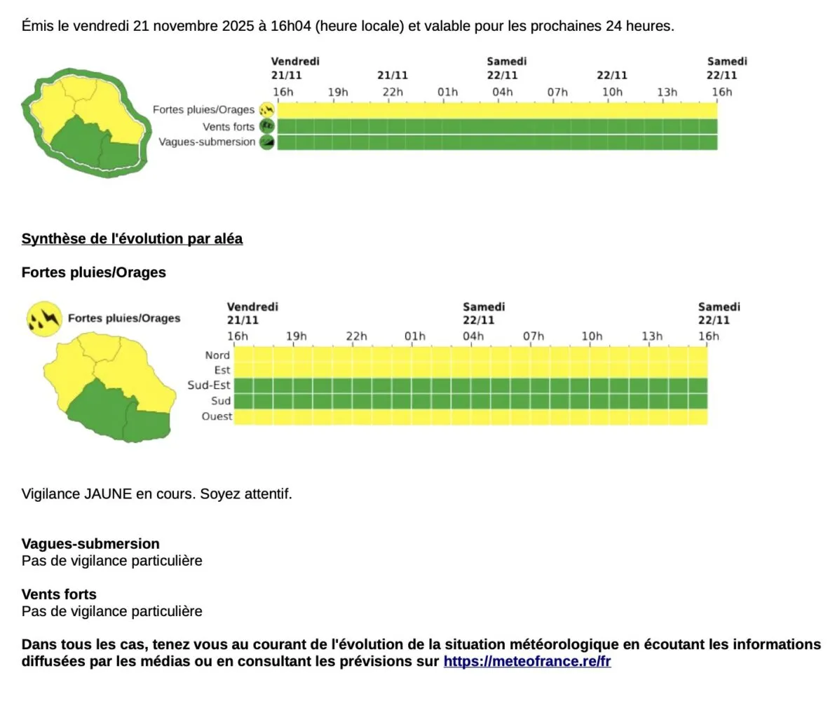 La journée se déroule sous un ciel souvent chargé avec des averses régulières, parfois soutenues selon les secteurs. La prudence est recommandée aux abords des radiers et des ravines en raison du ruissellement. Les sorties en montagne doivent être abordées avec vigilance. Le Sud reste globalement moins touché par les pluies.