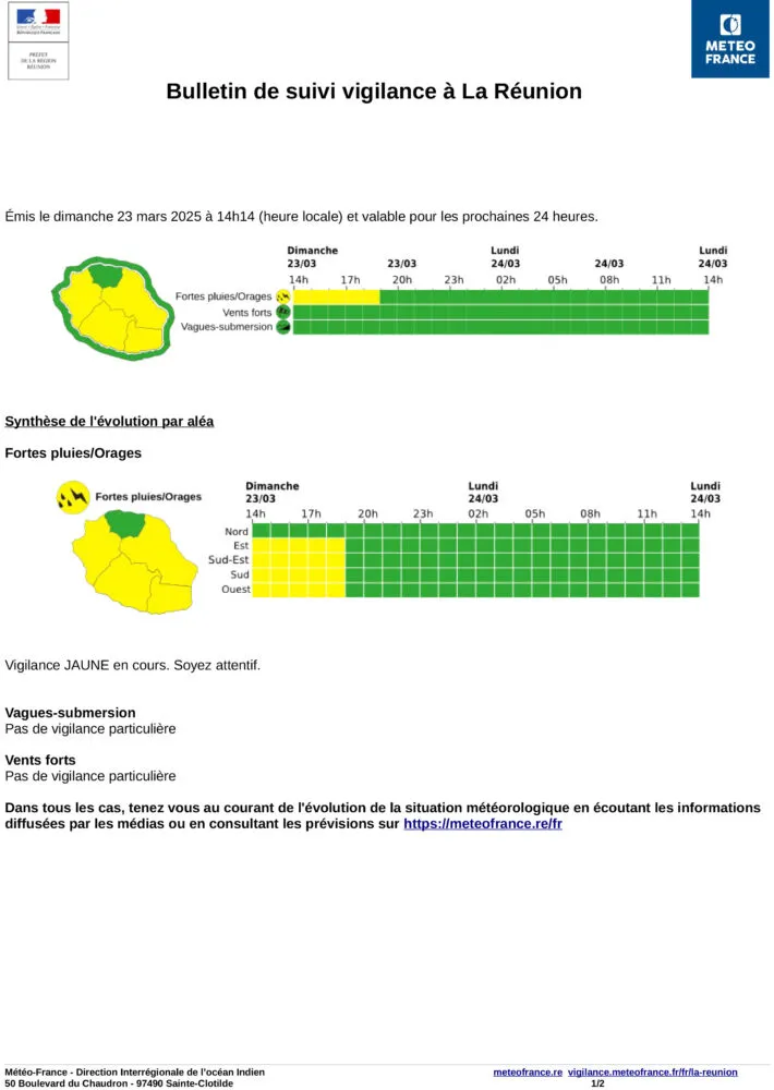 Météo-France a mis à jour son bulletin à 14h : la vigilance jaune pour fortes pluies et orages est maintenue jusqu’à 19h sur l’Ouest, le Sud, le Sud-Est et l’Est de l’île.