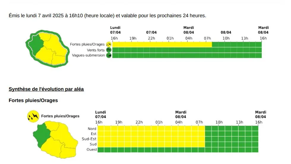 Météo France a placé actuellement le nord, l’est, le sud et le sud-est de La Réunion en vigilance jaune pour fortes pluies et orages. Cette vigilance est en cours et restera valable jusqu’à demain, mardi 8 avril 2025 à 7h.