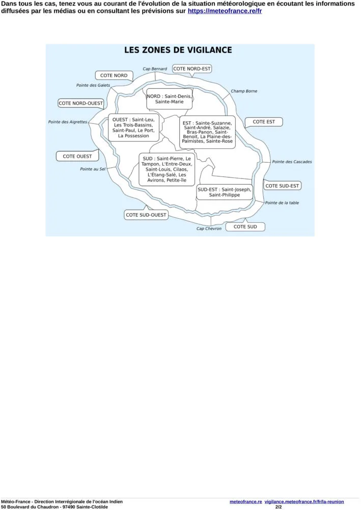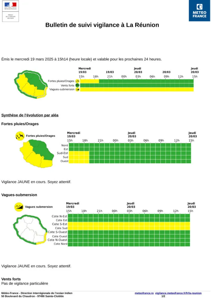 Une vigilance jaune pour fortes pluies et orages est activée sur l’ouest, le sud et le sud-est de La Réunion, valable jusqu’à minima 19h ce soir. Des conditions météorologiques instables sont attendues, avec des risques de pluies intenses et d’orages.