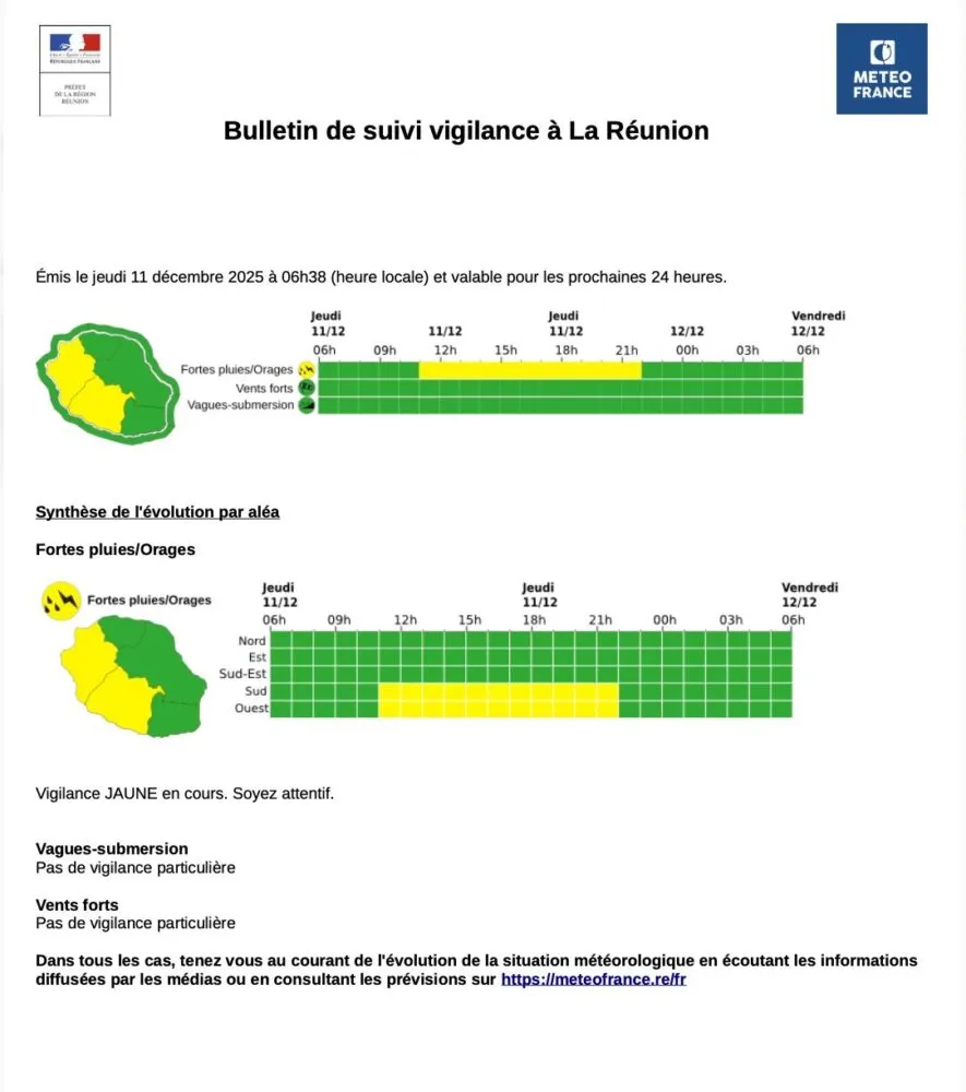 Dans son noueau bulletin météorologique de 16h, Météo-France a maintenu la vigilance jaune fortes pluies et orages jusqu’à 19h, pour ce jeudi 11 décembre 2025 dans le Sud, et l’Ouest de La Réunion.