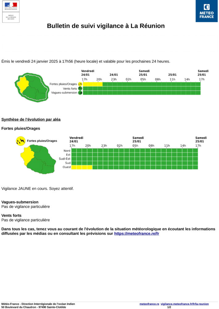 L’Ouest de La Réunion placé en vigilance jaune pour fortes pluies et orages. Météo France a émis un bulletin de suivi vigilance ce vendredi 24 janvier 2025 à 06h49, valable pour les prochaines 24 heures. Les conditions météorologiques indiquent des risques de précipitations et d’orages localisés dans cette zone.