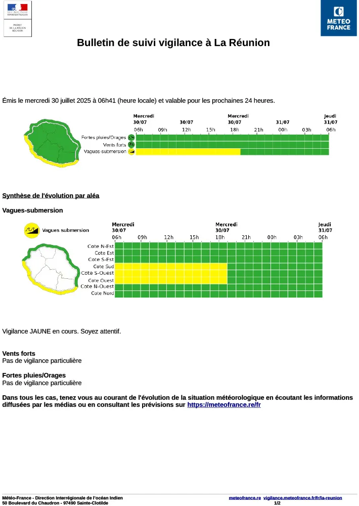 La plus grande prudence est donc recommandée en bord de mer à Saint-Paul, Saint-Gilles-les-Bains, l’Ermitage-les-Bains, la pointe des Trois-Bassins, Saint-Leu, la Pointe-au-Sel, les Avirons, l’Étang-Salé, Saint-Louis, Saint-Pierre, Petite-Île et Saint-Joseph.