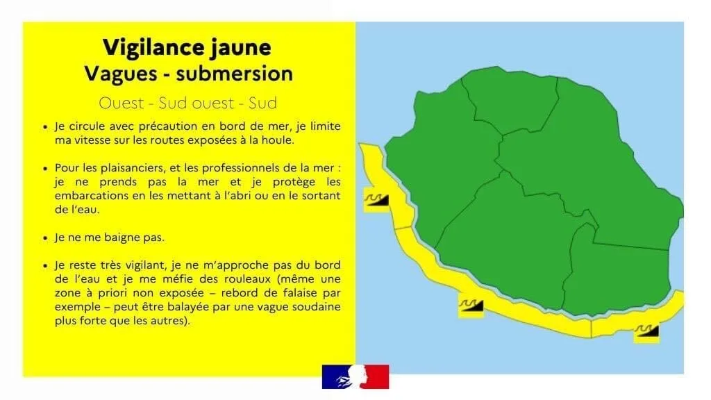 Prudence en mer ! Météo France a décrété pour 16h aujourd’hui une Vigilance jaune Vagues – Submersion concernant l’Ouest-Le Sud-ouest et le Sud d’île. Cela signifie qu’il y aura une longue houle de Sud-Ouest s’amplifiant environ 3 m entre la Pointe des Aigrettes et la Pointe de la Table, en passant par Saint-Pierre. Alizé d’Est à Sud-Est modéré à assez fort et toujours assez humide.