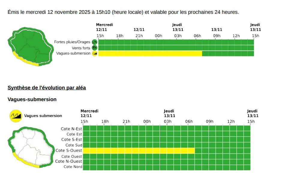 Météo-France a placé la côte sud-ouest de La Réunion en vigilance jaune vagues-submersion depuis ce mercredi 12 novembre. Cette vigilance reste valable jusqu’à demain, à 7h.