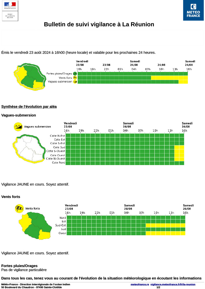 Météo France a émis plusieurs vigilances concernant les conditions météorologiques à La Réunion pour ce week-end du 24 août. Un épisode de vent fort et de houle australe exceptionnel est attendu, mettant en danger les régions de l’Ouest, du Sud et du Sud-Est.