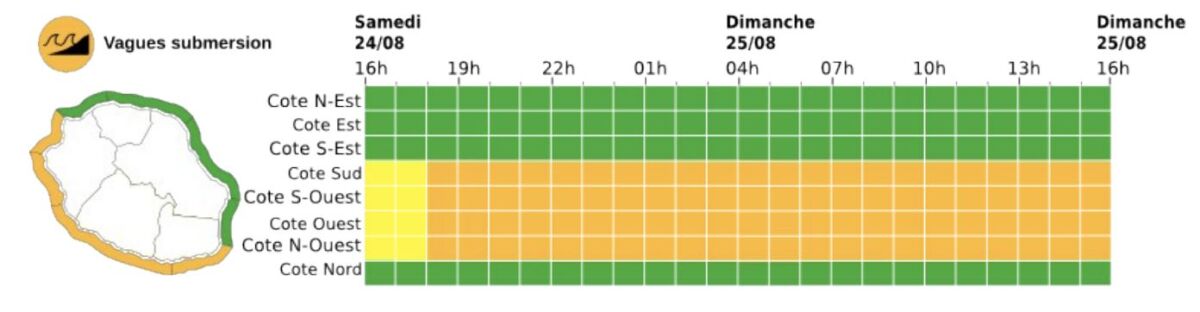 À partir de 14h samedi, une vigilance jaune pour vagues-submersion entrera en vigueur sur les côtes Ouest et Sud-Ouest. La houle de Sud-Sud-Ouest commencera à frapper les côtes réunionnaises et s’intensifiera rapidement, dépassant les 3 mètres en fin d’après-midi pour atteindre des vagues de 5,5 mètres au moment du pic, en cours de nuit de samedi à dimanche. La situation deviendra encore plus critique avec des vagues pouvant dépasser les 10 mètres. En réponse à cette intensité, la vigilance sera rehaussée à orange à partir de la fin de journée de samedi et jusqu’à dimanche soir.