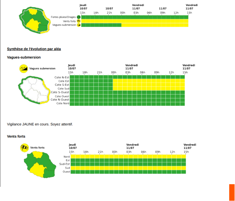 Météo-France place le nord et le sud de l’île en vigilance jaune pour vents forts qui va durer jusqu’à demain à 15h. Par ailleurs, les cotes Est, Sud-Est et Sud seront placées en vigilance jaune vagues-submersion ce soir, à partir de minuit jusqu’à demain à 15h.