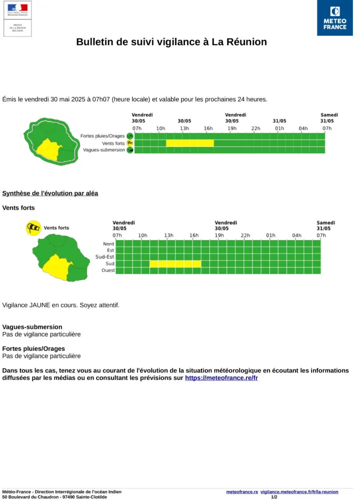 Météo France a émis une vigilance jaune pour vents forts concernant le sud de La Réunion, ce vendredi de 11h à 17h. Des rafales soutenues sont attendues dans cette zone.
