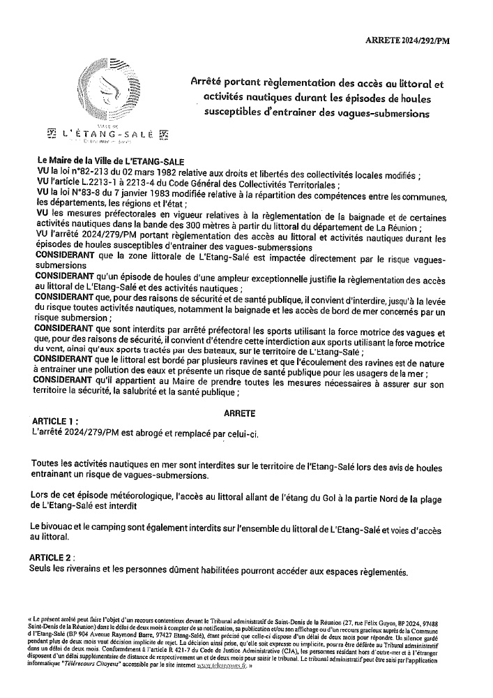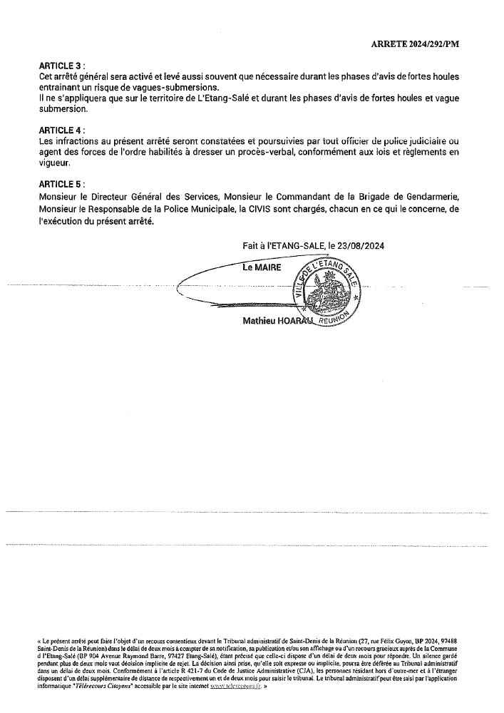 De même, l’accès au littoral, la baignade et la pratique des activités nautiques sur le littoral allant de la Grande Chaloupe jusqu’à la Ravine à Marquet sont interdits du samedi 24 août jusqu’au lundi 26 août 2024 à 14h.