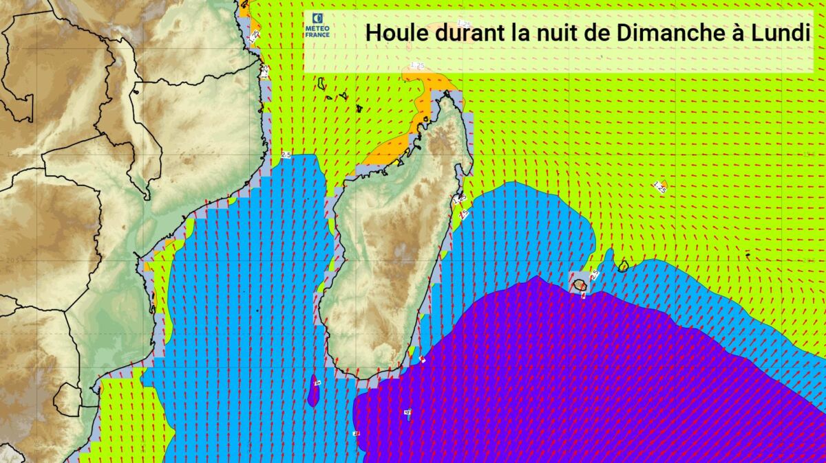 La houle de Sud-Sud-Ouest s’est amplifiée au cours de la nuit précédente en atteignant un pic de 4,50 mètres. Des hauteurs maximales de plus de 4 mètres sont encore attendues en matinée de lundi de la Pointe des Aigrettes à la Pointe de La Table, en passant par la Pointe au Sel. La période étant voisine de 14 secondes.