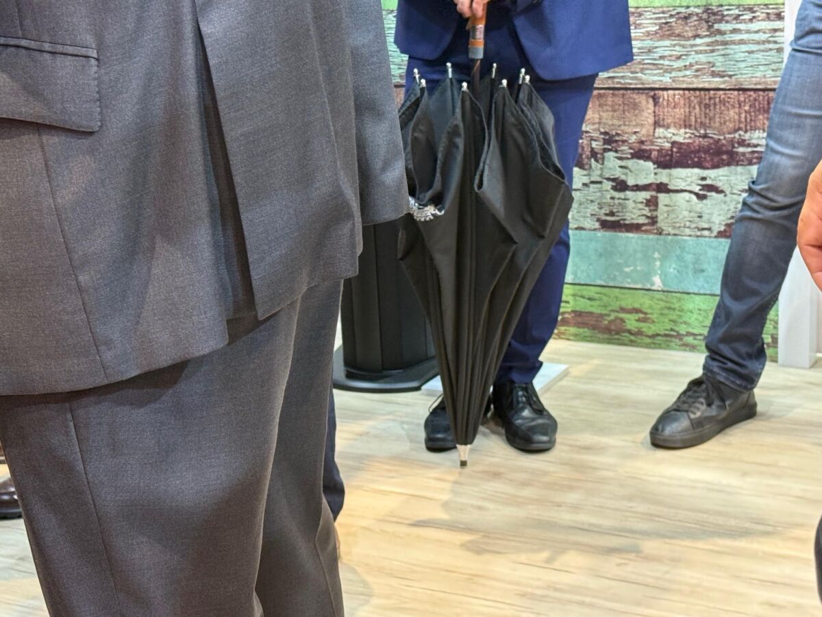 Ce n’est pas vraiment un parapluie pour se protéger de la pluie qui se trouve ici entre les mains d’un autre agent de sécurité mais bien un parapluie destiné à faire office de « pare-projectiles », genre œufs en cas de manifestation des agriculteurs et éleveurs.