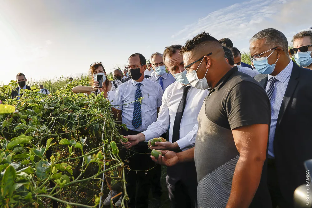 C’est avec beaucoup d’émotions que Guilène Ferrère s’est confiée au ministre de l’Outre-mer Sébastien Lecornu – accompagné du Président du Département Cyrille Melchior, de plusieurs élus et des acteurs du monde agricole – venu lui rendre visite sur son exploitation agricole à Mont-Vert-les-Hauts à Saint-Pierre le 13 février. « Je venais de perdre mon mari. J’ai repris ses activités avec mon fils dans un contexte difficile. Suite au passage du cyclone Batsiraï, nous avons perdu 80% de notre production de banane. Nous avons aussi connu des difficultés au niveau de l’élevage de porc et de poulets ; nous avons perdu un silo, un chauffe-eau solaire… » A côté de la bananeraie dévastée de Guilène Ferrère, les 4000 m² de parcelles de fruits de la passion de son voisin, Stéphane Fontaine, ont aussi subi des dégâts importants : « Les fruits n’avaient pas eu le temps de murir : ils sont tombés au sol et ne vont plus grossir : 70% de la production sont perdus » se désolent Stéphane Fontaine et son épouse qui estiment entre 20 et 25 000€ la perte de leur chiffre d’affaires.