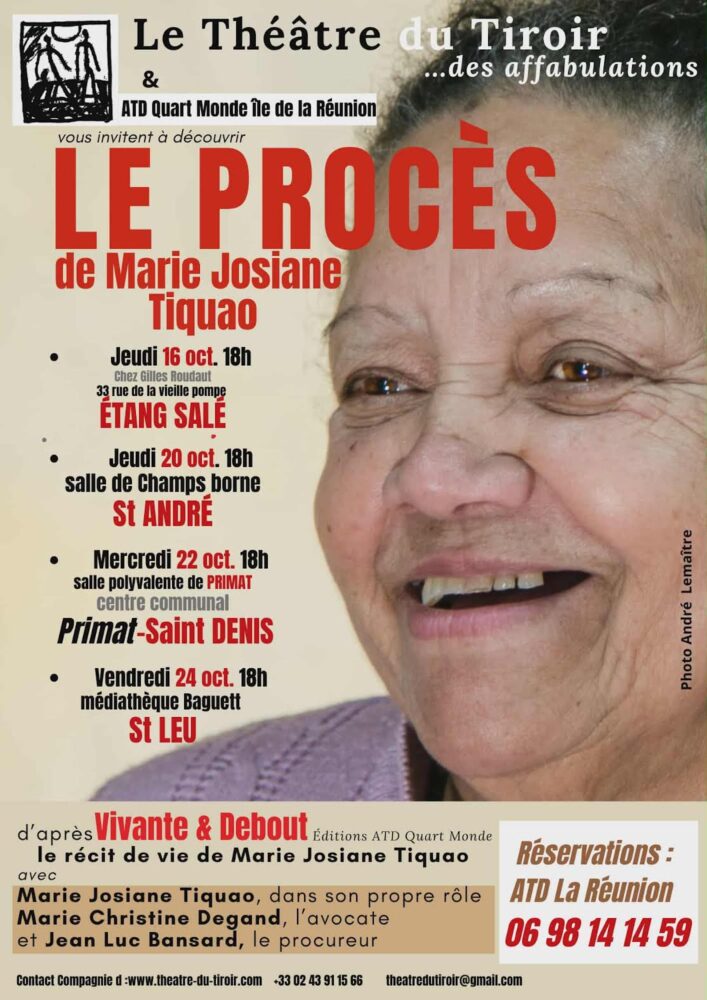 Madame Tiquao assure elle-même ses traductions pour nous dire, bien que venant d’une colonie, elle est aussi française. Dura lex, sed lex : La Loi est dure, mais c’est la Loi. Dans cette pièce, Marie Josiane Tiquao interprète son propre rôle, Marie Christine Degand joue l’avocate et Jean Luc Bansard, le procureur. Grâce à sa famille et au groupe local ATD quart Monde de la Réunion, deux scènes lui ont ouvert les portes : une représentation est prévue à Saint-Denis (salle Primat) le 22 octobre à 18 heures et une autre à la médiathèque Baguette à Saint-Leu le 24 octobre à 18 heures. Mais Marie Josiane Tiquao et ses « dalons » aimeraient bien jouer « Le procès » dans d’autres lieux, notamment dans la région Est de l’île, afin de sensibiliser les jeunes et les moins jeunes sur cette réalité encore bien présente de nos jours, à savoir les violences faites aux femmes. D’où son appel lancé aux décideurs locaux pour que des théâtres ou d’autres établissements puissent lui ouvrir leurs portes le temps de son séjour- peut-être son dernier ?- dans son île natale.