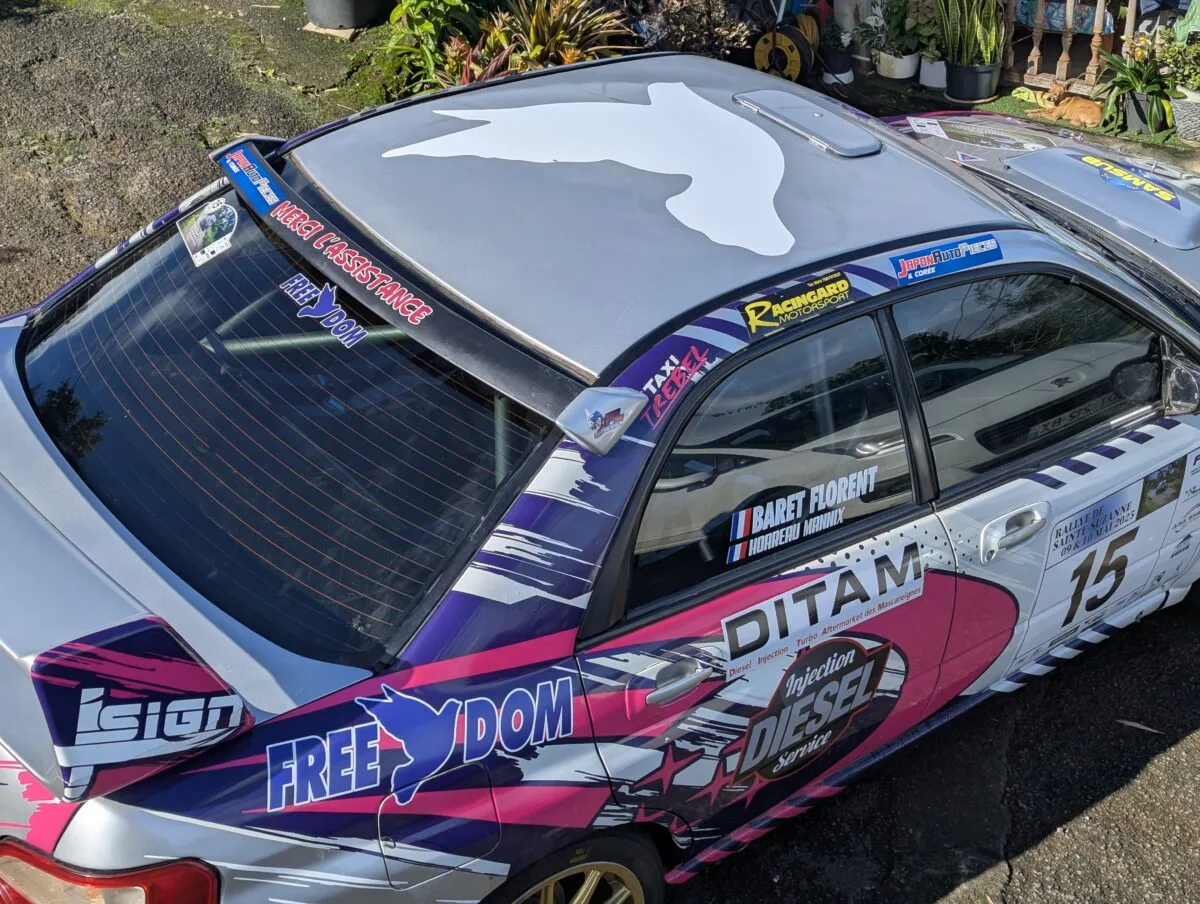 La Subaru Impreza N5, toute fière avec sa colombe sur le capot, va faire résonner son moteur dans les hauts, menée par Mannix Hoareau et son copilote Nicolas Tafilet