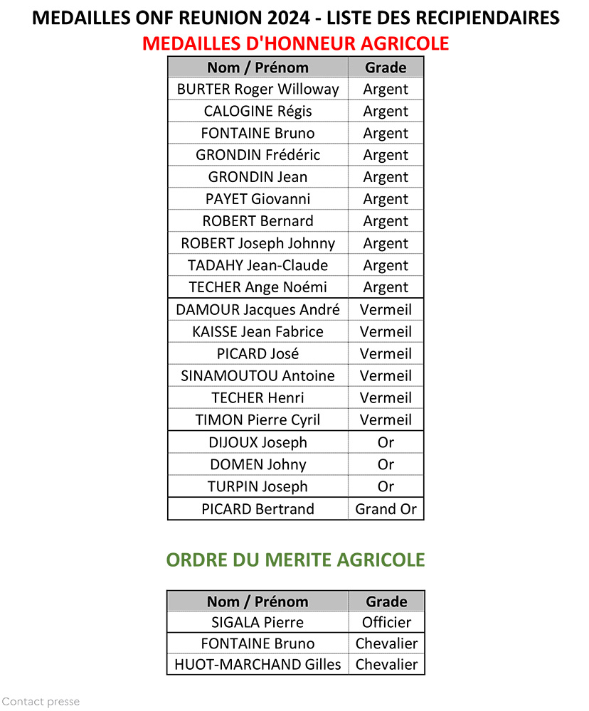 « Aujourd’hui est une journée spéciale qui vous est dédiée, vous qui recevez la médaille du mérite agricole ou la médaille d’honneur agricole. Partage, engagement, dévouement, professionnalisme et amour de la Nature, ce sont toutes ces qualités qui vous permettent de mener à bien les différents chantiers qui vous sont confiés (protection, accueil, production, encadrement social…, et dont la réalisation fait la fierté de l’ONF Réunion. »