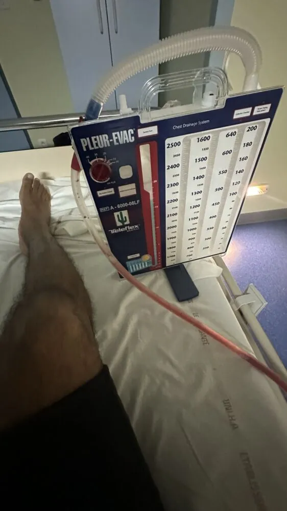 Et ce n’est qu’à 20h que l’équipe médicale a pris la décision de lui poser un drain de 20 cm pour libérer l’air et pour que son poumon compressé puisse reprendre sa taille et sa positon initiale, une première tentative ayant échouée sur le coté droit de son torse, une deuxième tentative sur la poitrine a été couronnée de succès pour enfin atteindre la cavité pleurale, dans la douleur car juste une anesthésie locale superficielle.