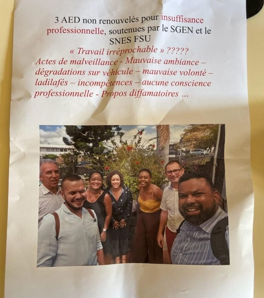 Un retour par Saint-Louis, au collège Plateau Goyave précisément. J’avais fait un article en début de semaine sur « le cri d’alarme » lancé par des AED (assistants d’éducation) dont le contrat n’avait pas été renouvelé par le rectorat. Des AED se disant « victimes » des commérages d’une autre AED « protégée » par le principal de l’établissement. En guise de réponse à l’article, une photo a été placardée dans la cour du collège pour les dénigrer. Ça vole pas haut dans ce collège où, me dit-on, le principal a trouvé l’article « diffamatoire ». Si c’est le cas, il n’a qu’à porter plainte !