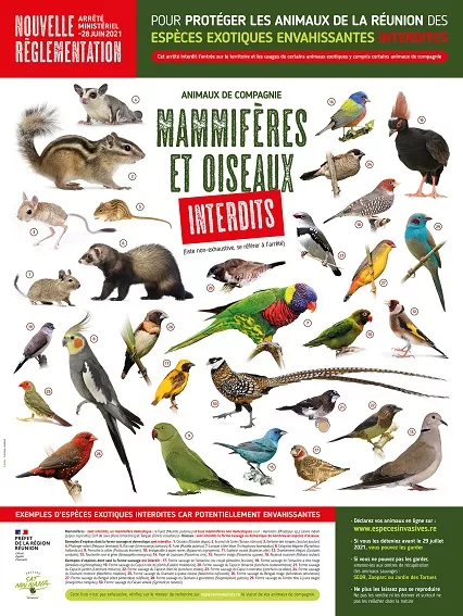 Afin de préserver le patrimoine naturel exceptionnel de l’île, un arrêté relatif à la prévention de l’introduction et de la propagation des espèces animales exotiques envahissantes sur le territoire a été co-signé le 28 juin 2021 par les ministres en charge de l’écologie et de l’agriculture. En effet, les espèces exotiques envahissantes sont la première cause de la perte de la biodiversité à La Réunion.