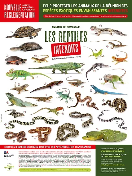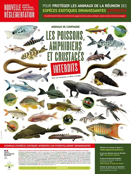 Ainsi, tous les amphibiens, la quasi-totalité des reptiles (sauf les tortues terrestres et 10 espèces nécessitant un certificat de capacité), les mammifères sauvages en dehors de 4 espèces et une espèce domestique (le furet) ont été interdits. Des espèces d’oiseaux et de poissons sont également concernées.Ces espèces menacent la biodiversité originelle de notre île, car elles peuvent les consommer ou prendre leur place dans les milieux naturels.Trois posters joints donnent quelques exemples des espèces concernées.