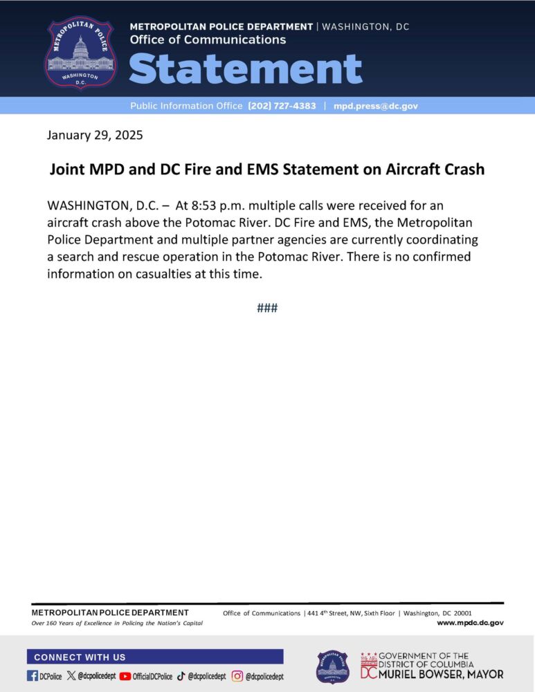 Suite à l’accident, tous les décollages et atterrissages ont été suspendus à l’aéroport de Washington Reagan, situé à Arlington, en Virginie. Les services d’urgence ont été immédiatement mobilisés pour intervenir sur les lieux du crash.