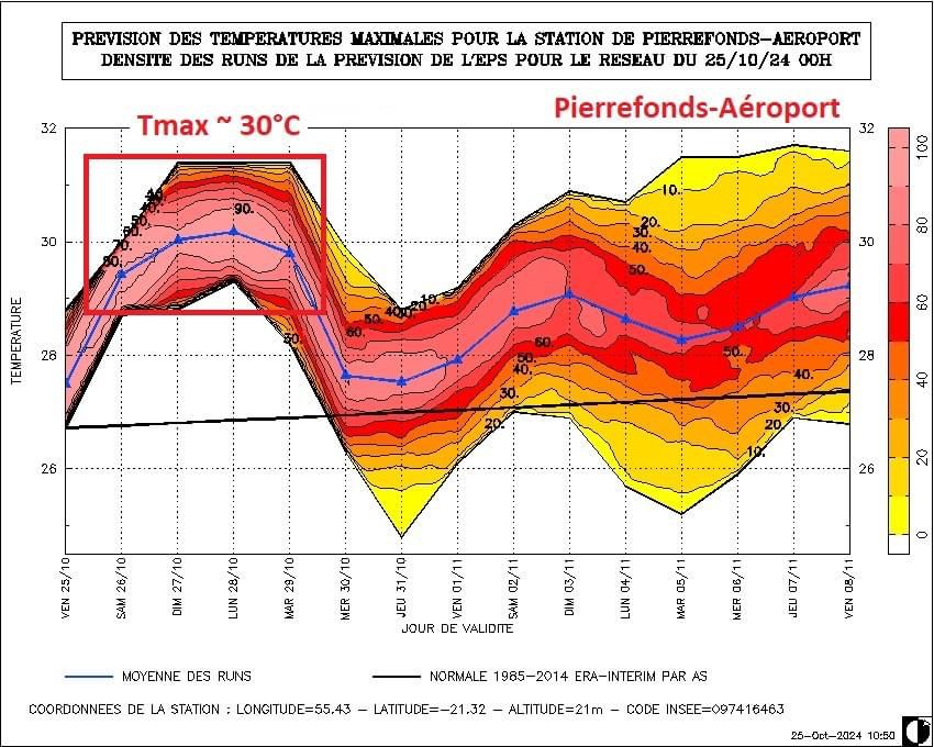 Les températures maximales avoisineront ou dépasseront les 30°C dans les régions basses de l’île, un phénomène inhabituel aussi tôt dans la saison. Le record d’octobre à la station de Gillot-Aéroport (30.7°C enregistré le 27 octobre 2023) pourrait même être approché ce week-end. Les nuits seront également plus chaudes, avec des minimales dépassant souvent les 23 à 24°C sur le littoral.