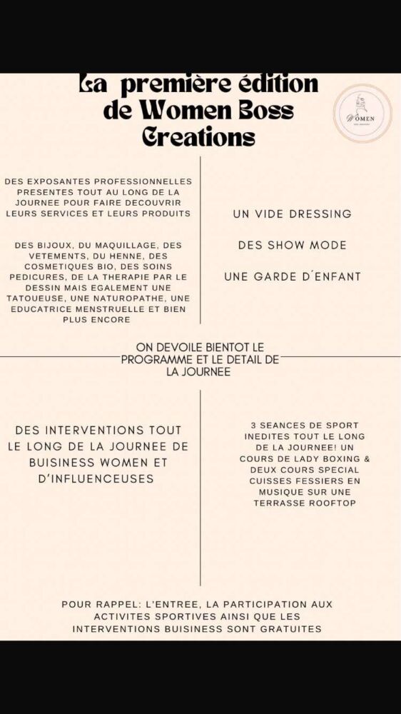 Organisé par et pour les femmes, Women Boss Création propose un programme varié qui saura séduire toutes celles qui aspirent à développer leur business ou simplement à s’inspirer des parcours d’autres entrepreneuses. Au programme : des animations sportives sur rooftop, des sessions de boxe, des ateliers axés sur le bien-être et la confiance en soi, mais aussi un défilé de mode mettant en avant le fitness et le casual wear.