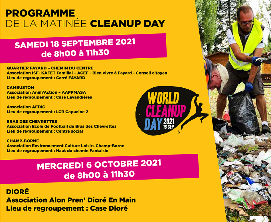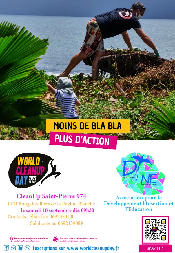 Cette année encore, il est important de se mobiliser. Le World CleanUp Day fait appel à tous les citoyens, entreprises, écoles, collectivités et associations qui souhaitent organiser et/ou participer à une opération de nettoyage. Autour de leur domicile, à l’école, un chemin ou une ravine… Il suffit de passer le mot pour former un groupe et organiser sa propre collecte de déchets. Toutes les informations pour se faire connaître et mettre en place une action de nettoyage sont indiquées sur : www.worldcleanupday.fr