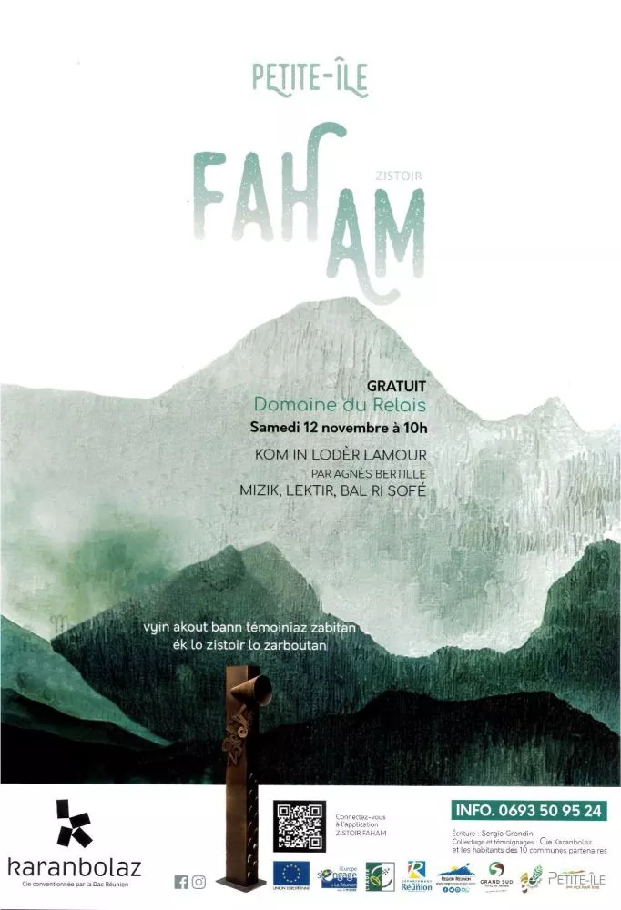 Conçu par la Compagnie Karanbolaz, Zistoir Faham est un parcours artistique, sillonnant le Sentié Fah’âme de Saint-Philippe au Tévelave. Dix sculptures, les Zarboutans, seront installées le long du sentier dans les dix communes du sud de l’île, portant un récit à écouter en ligne.